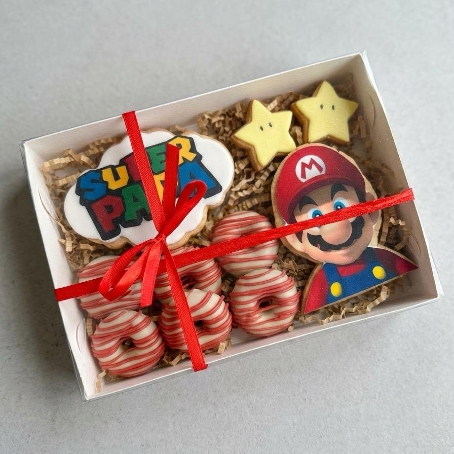 Nuestra caja de galletas “Súper Papá” inspirada en Mario Bross es el detalle perfecto para este Día del Padre: divertida, original y deliciosa.