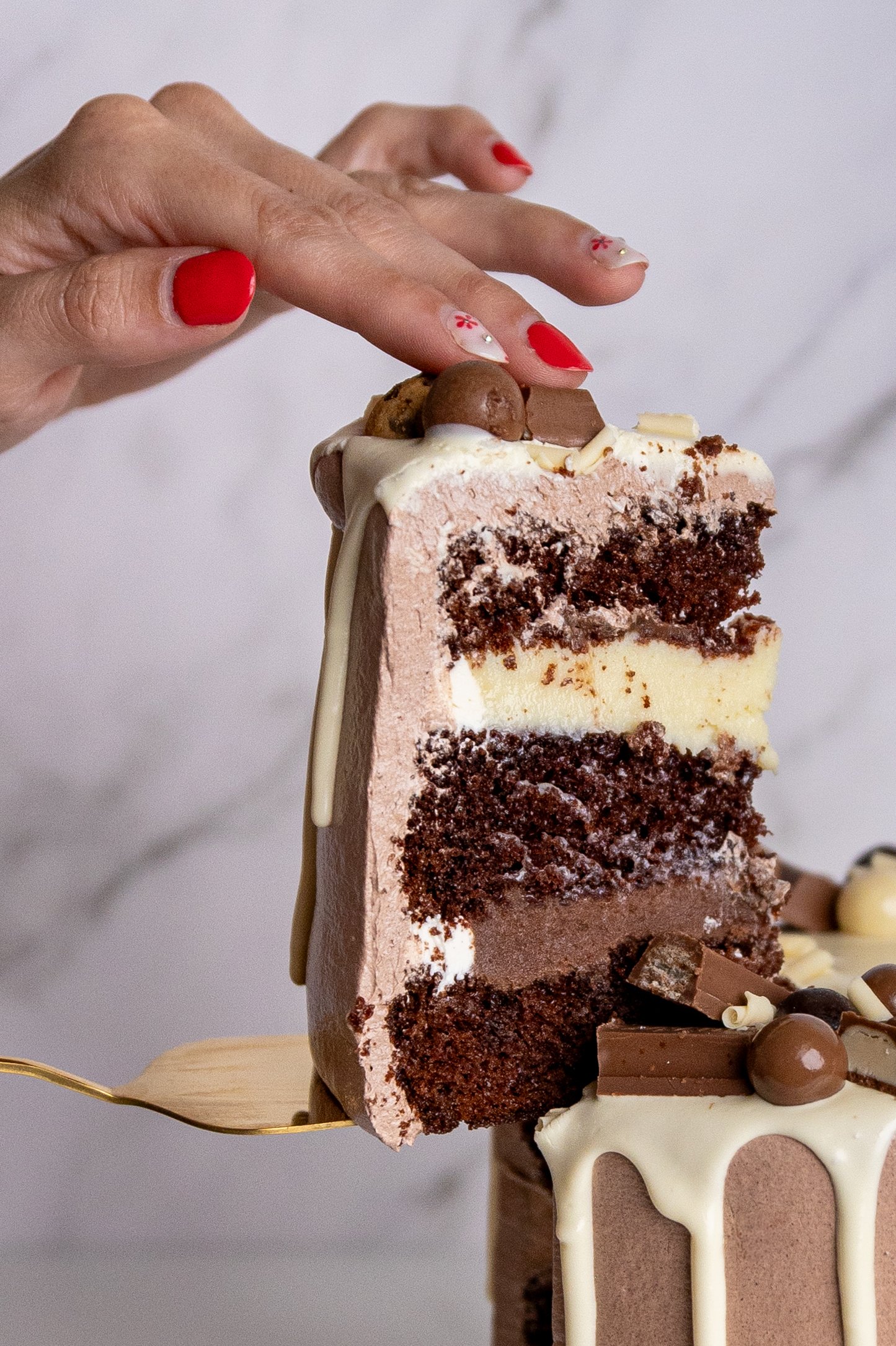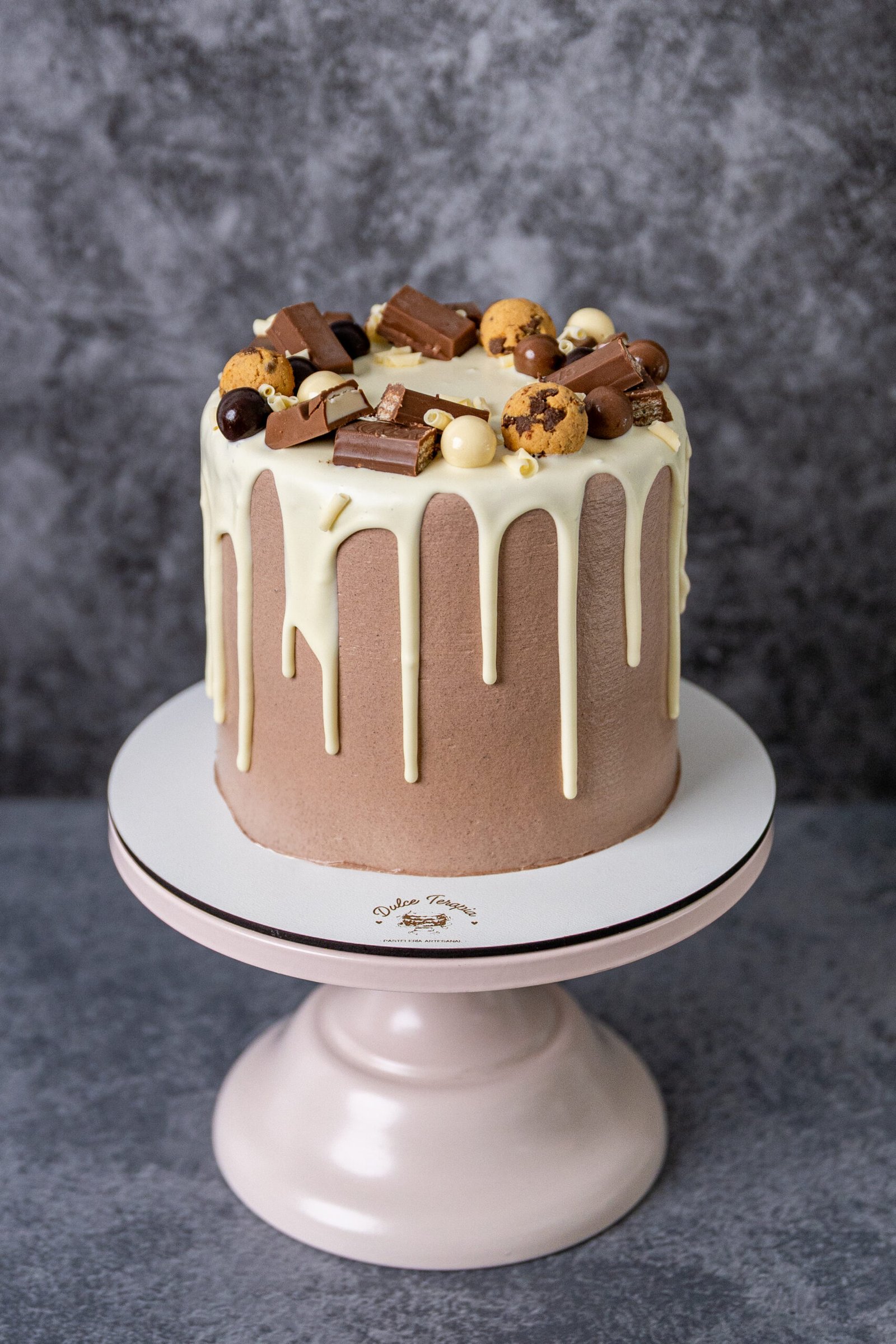 Lo que realmente distingue a este pastel con bizcocho de chocolate es su relleno: una rica y cremosa combinación de ganache de chocolate con leche y chocolate blanco. Además de esta rica combinación, va decorado con chocolatinas y mini cookies.