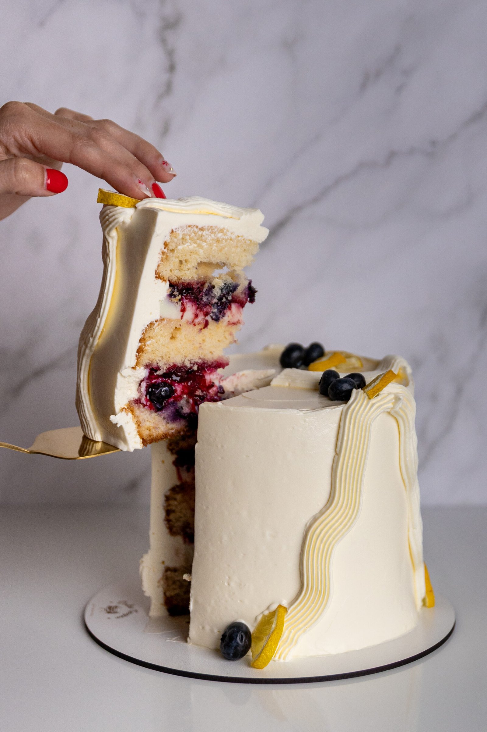 Nuestro pastel de limón con arándanos está hecho con un esponjoso y jugoso bizcocho de vainilla con arándanos frescos y relleno de mousse de limón con compota de frutos rojos. Este pastel es la elección perfecta para aquellos que buscan una combinación única de sabores frescos, dulces y cítricos.