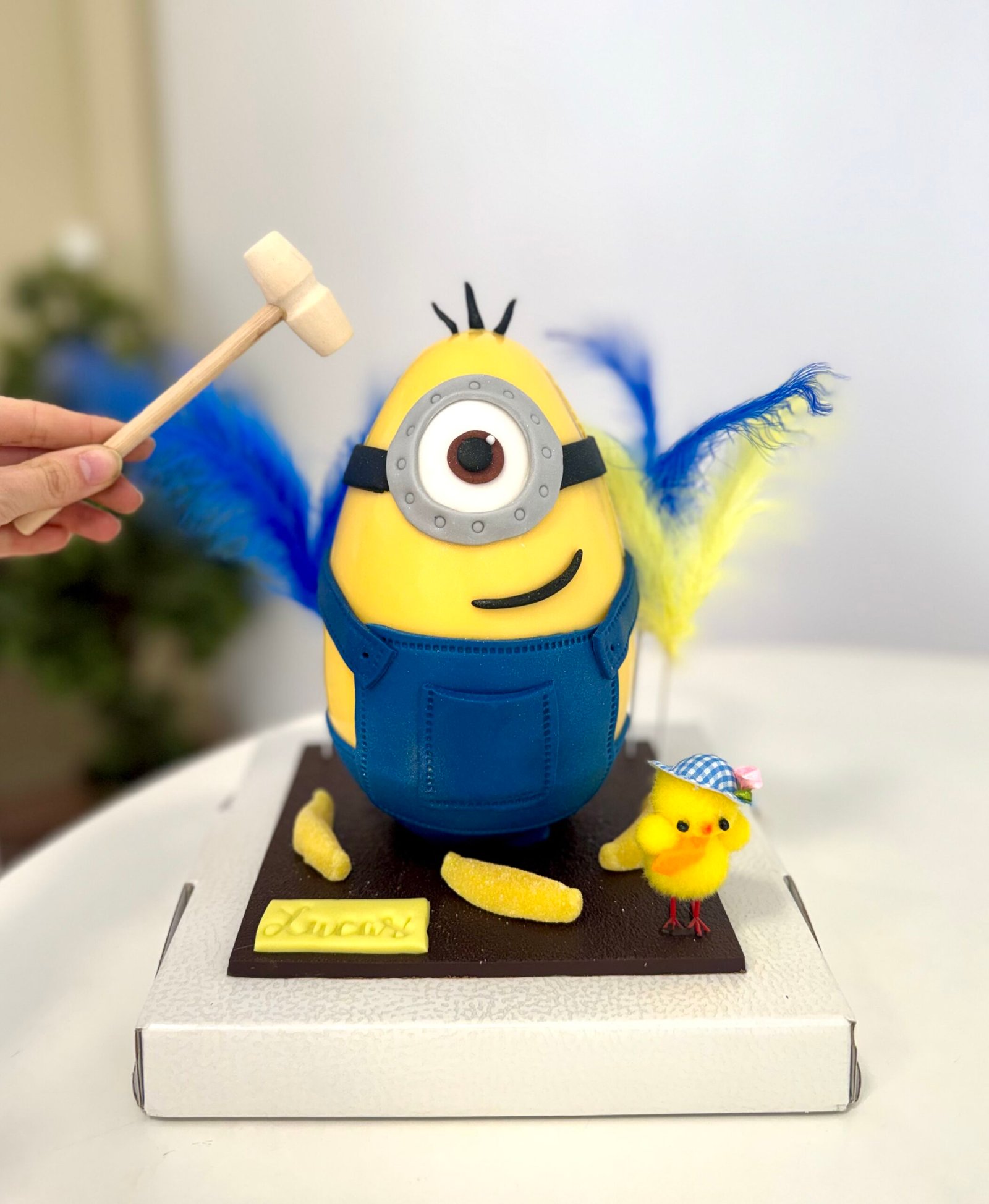 Nuestra mona piñata Minion esta hecha con un huevo de chocolate blanco relleno de mini cookies, chuches y chocolatinas. La base es de chocolate con leche y los detalles de la ropa están hechos en fondant. Se puede personalizar con nombre. Acompaña un martillo para que se pueda romper el huevo, pollo y plumas.