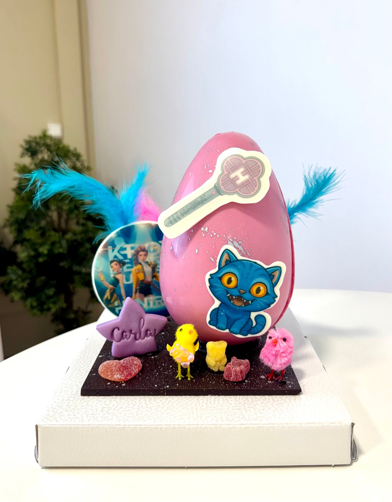 Nuestra mona piñata K-Pop Demon Hunters esta hecha con un huevo de chocolate blanco relleno de mini cookies, chuches y chocolatinas. La base es de chocolate con leche. Acompaña imágenes de chocolate, un martillo para que se pueda romper el huevo, pollo y plumas. Se puede personalizar con el nombre.