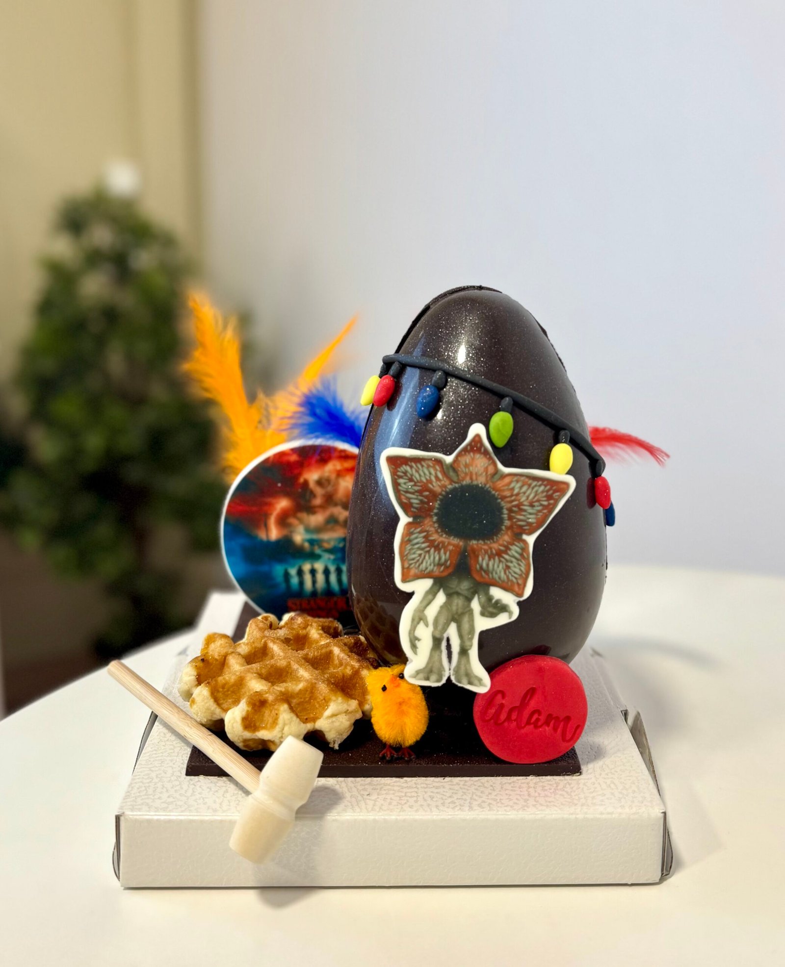 Nuestra mona piñata Stranger Things esta hecha con un huevo de chocolate con leche relleno de mini cookies, chuches y chocolatinas. La base también es de chocolate con leche. Acompaña imágenes de chocolate, un gofre, un martillo para que se pueda romper el huevo, pollo y plumas. Se puede personalizar con el nombre.