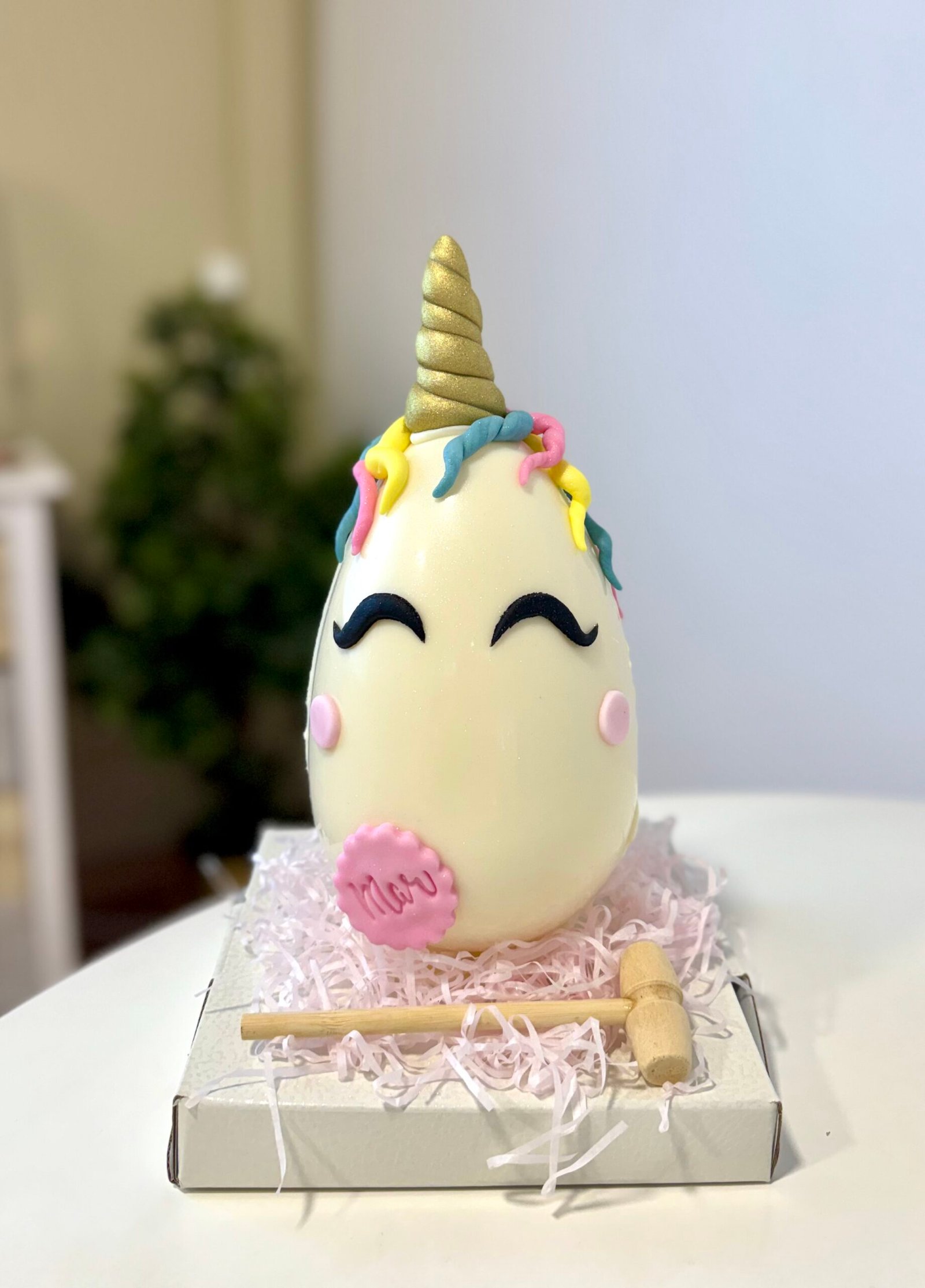 Nuestra mona piñata Unicornio esta hecha con un huevo de chocolate blanco relleno de mini cookies, chuches y chocolatinas. La base también es de chocolate blanco y los detalles están hechos en fondant. Se puede personalizar con nombre. Acompaña un martillo para que se pueda romper el huevo.